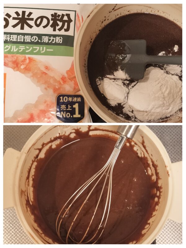 米粉(約40g)を加えて、ダマや粉っぽさが無くなるまで泡だて器やゴムベラ等で良く混ぜ合わせます。