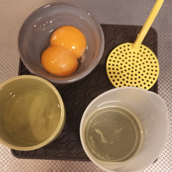 ・卵を卵黄と卵白に分けておきます。卵白1個分をふわふわエッグメーカーの容器に入れ、もう1個分の卵白は別の容器に入れておきます。卵白を冷蔵庫に入れておきます
