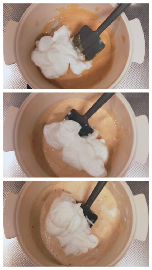 生地にメレンゲを混ぜ合わせる前に、一度、生地を底から全体を軽く混ぜ合わせてから、メレンゲを3回に分けて混ぜ合わせます。