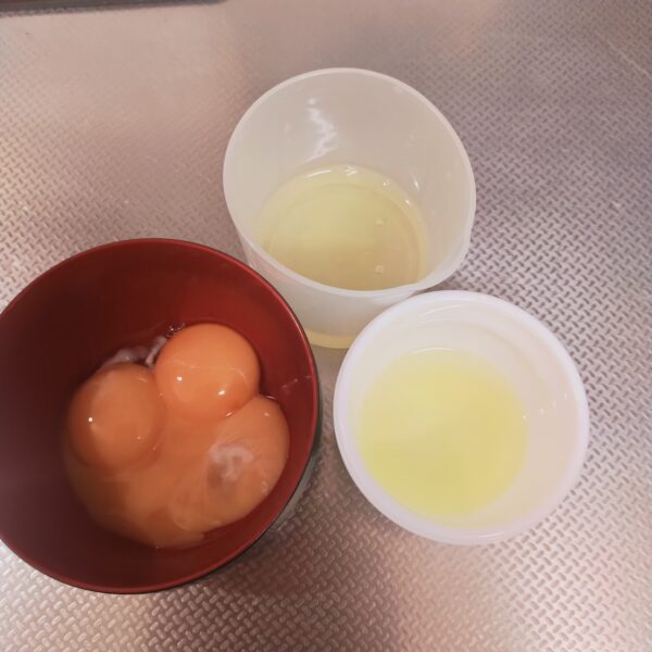 レンジ加熱している間に卵を卵黄と卵白に分けます。卵白約1.5個分ずつをふわふわエッグメーカーの容器と、別の容器に入れ、卵白を冷蔵庫に入れておきます。