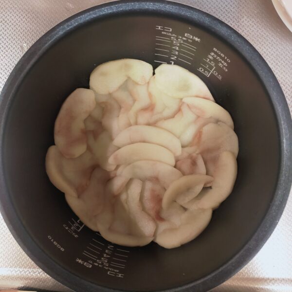 りんごの皮をむき、くし形に切りさらに約1㎝幅に薄切りにし、塩水にさらし、水けを切ってからレンジ耐熱容器に入れさとうきび糖(約小さじ2)をまぶし、フタかラップをかけてりんごが柔らかくなるまでレンジ加熱し(600wで約2~3分)粗熱を取ります。電子レンジにより加熱時間は加減してください