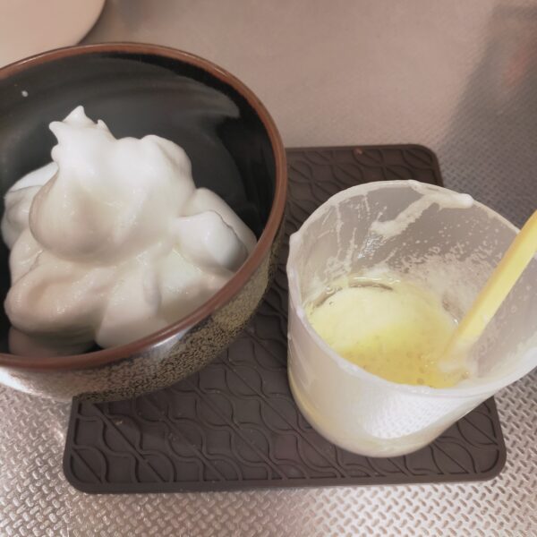 出来あがったメレンゲは別の容器に移し、ふわふわエッグメーカーの容器を洗わずに、そのままもう1.5個分の卵白を入れ同じようにメレンゲを作ります。