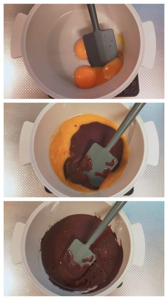 ボウルなどの容器に卵黄(3個分)、米油(10g)を入れて混ぜ合わせ、1の溶かしたココアパウダーを数回に分けて加え混ぜ合わせます。