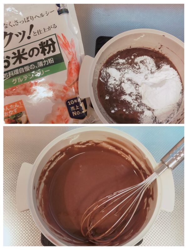 米粉(約50g)を加えて泡だて器に持ち替えて、粉っぽさやダマが無くなるまで良く混ぜ合わせます。