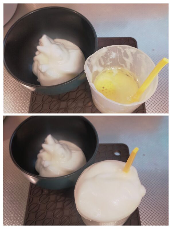 ③別の容器にメレンゲを移し、ふわふわエッグメーカーの容器を洗わず、もう一つの1.5個分の卵白をふわふわエッグメーカーの容器に入れ再度同じようにメレンゲを作ります