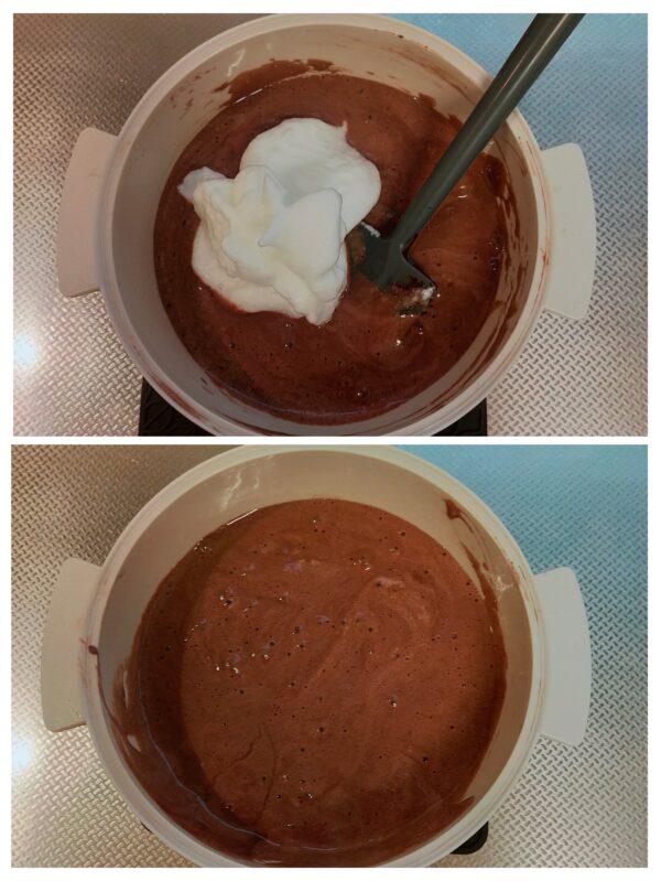 3.を一度、底から全体を軽く混ぜ合わせてからメレンゲを3回に分けて生地に混ぜ合わせます。