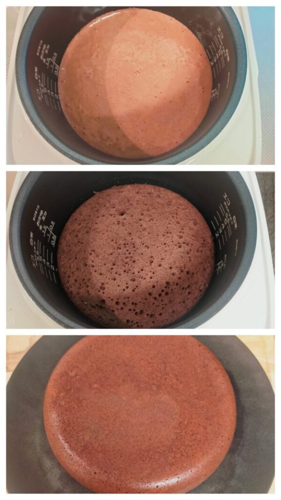 ご家庭の炊飯器により加熱時間は加減してください。竹串などで刺して見て生焼けの生地が付いてこなければ焼き上がりです。