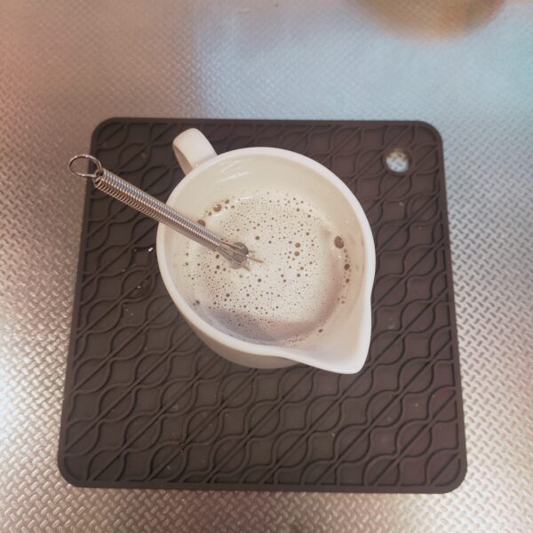 温めておいた豆乳は全て入れなくても大丈夫です。ココアパウダーが溶けたらOK。残りの豆乳は後の工程で混ぜ合わせます。