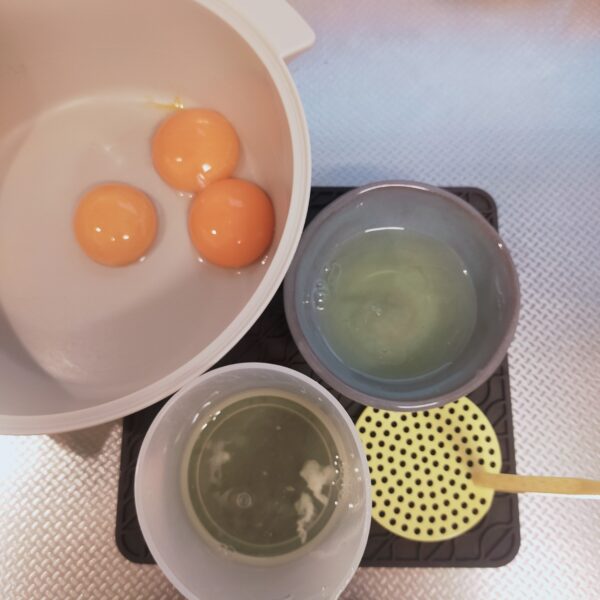 卵白半分位ずつ分けるのは、なんとなく半分ずつ位で大丈夫です