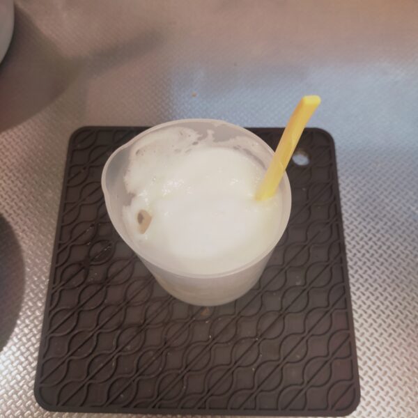 レンジ加熱対応容器に、無調整豆乳(70㏄)を入れ600wで約50秒レンジ加熱し、きび砂糖(35g)を加えて、よくかき混ぜて砂糖を溶かします。